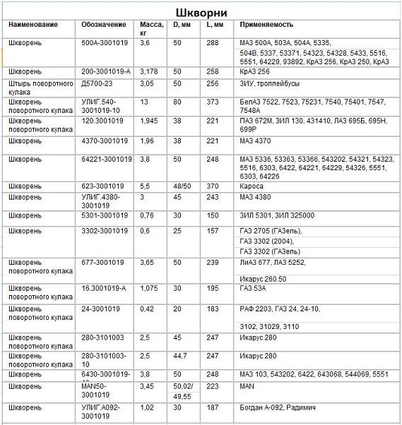 Таблица размеров шкворней и втулок: